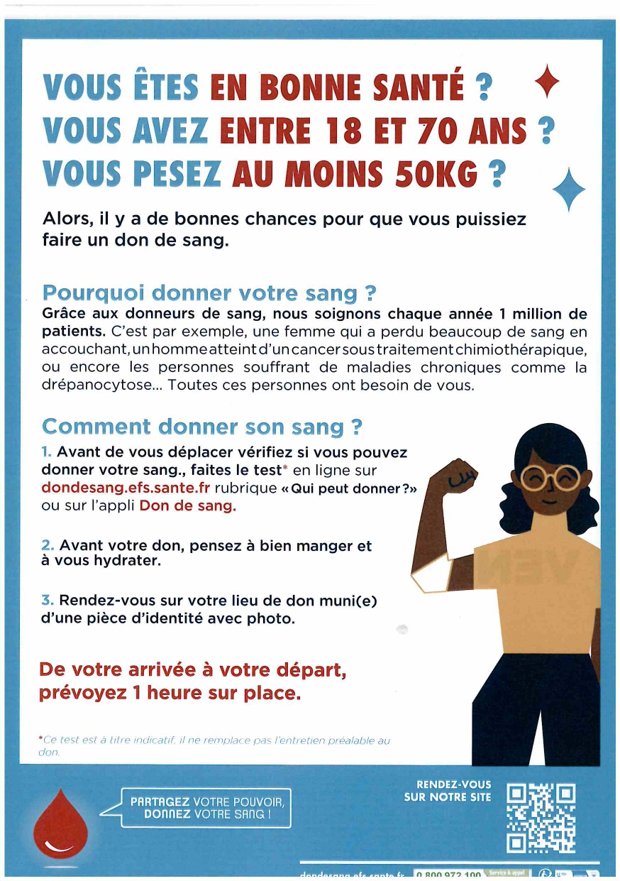 Organisation d'un don du sang au collège vendredi 13 février en salle polyvalente